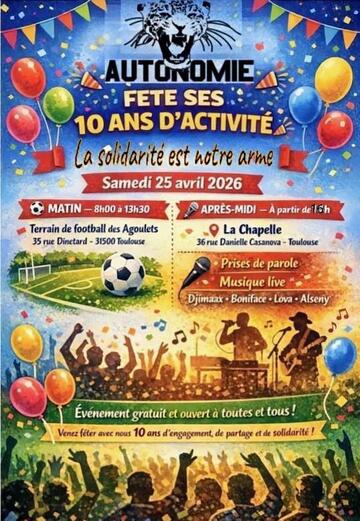 En avril 2026, AutonoMIE fêtera ses 10 ans. Le collectif vous invite à sa fête d’anniversaire qui aura lieu a la Chapelle (36, rue Danielle Casanova)