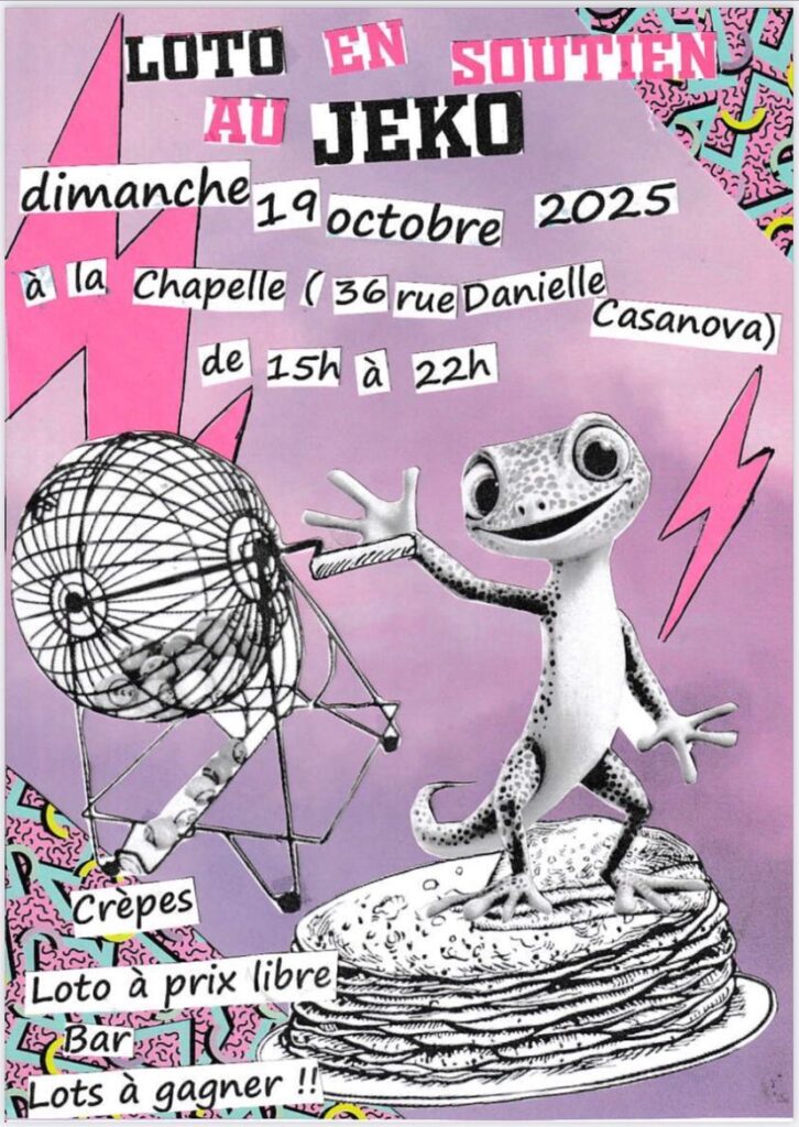 Viens soutenir le Jeko le 19 octobre à la Chapelle : supers lots à gagner, bar, crêpes et goodies toute l’après-midi !